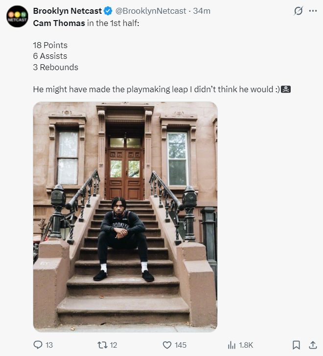 托马斯首节6中6,三分1中1,罚球1中1拿到14分1篮板1助攻1抢断,NBA官方都发推为他打Call,首节他帮助篮网打出39-29的高潮。