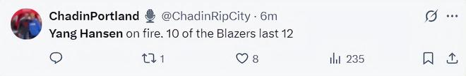 开拓者球迷:开拓者过去12分里有10分是杨瀚森一人拿的。