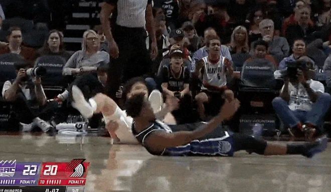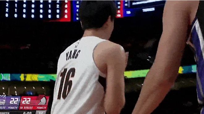 杨瀚森为格兰特掩护时与蒙克相撞倒地,杨瀚森的对抗性的确还是有些不足,跟小后卫撞一下都扛不住。