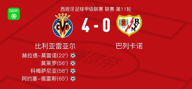 北京时间11月1日,西班牙足球甲级联赛第11轮,比利亚雷亚尔坐镇主场迎战巴列卡诺。比赛中,米卡塔泽送出助攻,赫拉德-莫雷诺破门得分,为球队取得领先。随后,佩德拉萨助攻莫莱罗扩大比分。仅两分钟后,莫莱罗送出妙传,科梅萨尼亚接球后破门,将优势进一步巩固。第65分钟,阿约塞-佩雷斯攻入一球,锁定胜局。最终,比利亚雷亚尔以4比0战胜巴列卡诺。