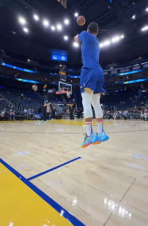 就是准!库里赛前热身时连中logo三分,轻松写意